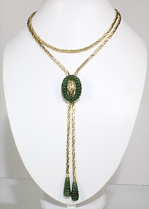 Collier, GG 750/000, gravierte "RUSSISCHE-JADE, Mittelteil verschiebbar, 2 Pampeln als Abschluß, Länge ca. 105,0 cm, total 80,9 g