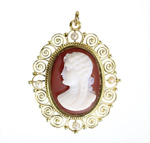 Anhänger, GG 585/000, Frauenportrait nach links, geschnittener Lagenachat, 4 kl. Akoja-Perlen H = 40,0 mm