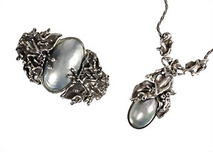 Lot: Schmuck mit Muschelbesatz, Silber 925/000, 1 Collier mit integrierten Anhänger, in Schweißstrucktur gestaltete Oberfläche, vorne H = 54,3 mm, L = 43,0 cm; Armreif-Spange, Breite oben: ca. 36,1 mm, Innen: ca. 57,5 x 42,5 mm