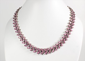 Collier, Silber 925/000, 118 Stck. rosafarbene, in Navetteform geschliffene Steine, in der Mitte 58 Stck. runde Steine, die einzelnen Glieder sind beweglich gearbeitet, integriertes Kastenschloss mit 2 Sicherheitsachten, L = 43,5 cm, total 88,8 g