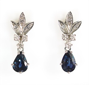 1 Paar Ohrhänger, WG 750/000, 2 Saphirtropfen ca. 2,0 ct (facettier), 6 Brillanten ca. 0,20 ct tw-vsi, 6 Diamanten weiß, H = 22,5 mm (2 Plastik Mechaniken !)