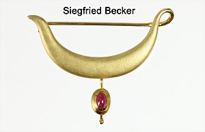 Brosche "SIEGFRIED BECKER", GG 585/000 sig.: SB, kl. Rubincabochon, L = 36,7 mm