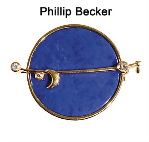 Brosche, "PHILIP BECKER" Pforzheim, GG 585/000 feinvergoldet, Lapisscheibe, 3 Brillanten ca. 0,10 ct tw-vsi/si, D = 27 mm, kl. Tropfen beweglich