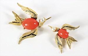 Lot: 2 Vögel, goldfarben, sig. B.S.K., korallenfarbene Cabochons, Kunstperlen, L = 38,5 mm u. 48,0 mm Für diesen Artikel ist ein Versand in nicht EU-Länder leider nicht möglich ! No shipping outside of the EU !