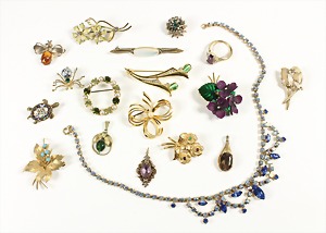 Lot: 18 Teile Modeschmuck, 13 Broschen u. a. Papageien, 1 Schildkröte, 1 Spinne, 1 Fliege …., 3 Anhänger, 1 Ring u. 1 Collier, mit Strasssteinen, Opalglas, Kunstperlen, Emaillelack etc.
