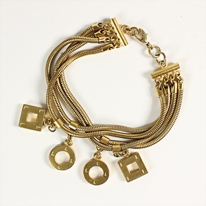 Armband "KARL LAGERFELD", Metall: goldfarben, sig.: LAGERFELD, 4-reihiges Armband (Schlangen-Kette), mit 4 quadratischen u. kreisförmigen Anhängern, L = ca.21,5 cm