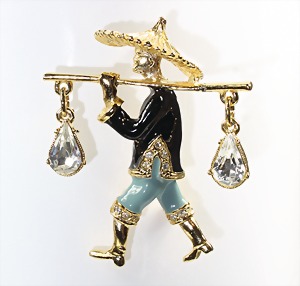 Brosche, "CHINESE" (Wasserträger), goldfarben, SPHINX USA, Modell Nr° 2911, schwarz u. blau emailliert, weißer Straßbesatz, abgehängte weiße Tropfen, plastisch ausgearbeitet, H = 47,5 mm, sehr schöner orig. Zustand !