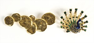 Lot: 2 Broschen, goldfarben, 1 Brosche, "KREISE", sig.: Cecile Jeanne PARIS, ca. 90,0 x 36,5 mm; 1 Brosche, "PFAU", sig.: SPINX, grüner u. blauer Emaillelack, besetzt mit grünen u. blauem Strass, ca. 49,5 x 43,5 mm