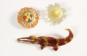 Lot Modeschmuck: 1 "KROKODIL", sig. LEA STEIN PARIS, L = 81,4 mm; 1 "BLÜTE", sig. ALEXIS BITTAR, D = ca. 34,5 mm,; 1 "SONNE", sig. Goebel, D = 34,6 mm