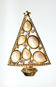 Weihnachtsbaum-Brosche, goldfarben, unsigniert (USA), Kunstperlenbesatz u weißer Strass, H = 57,0 mm