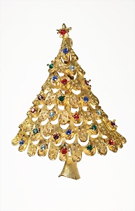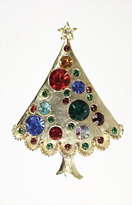 Weihnachtsbaum-Brosche, goldfarben, signiert JJ (= Jonette Jewelry, USA), unterschiedlich farbige Strasssteine. H = 58,5 mm