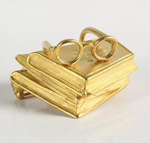 Brosche, ein Stapel "BÜCHER" mit Brille, goldfarben, unsig., ca.35,2 x 31,2 mm