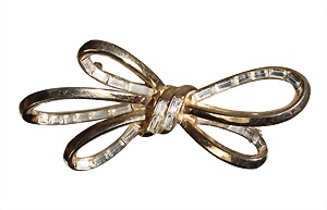 Brosche in Form einer Schleife, goldfarben, "TRIFARI" USA, signiert TRIFARI, weiße Steine im Baguetteschliff, L = 68,8 cm