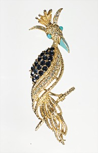 Brosche, "VOGEL", goldfarben, sig. FLORENZA (USA), weißer u. blauer Steinbesatz, Lackemaille, H = 93,5 mm