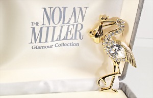 Brosche, "STORCH", goldfarben, sig. NOLAN MILLER (USA), weißer Strassbesatz, Storch mit einem Bündel im Schnabel (abnehmbar), ca. 57,7 x 41,5 mm, Original-Etui