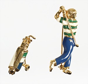 Zweiteilige Brosche, unsigniert, plastisch ausgearbeiteter Golfspieler mit Schläger-Caddy, farbige Emailleauflage, H = 47,7 mm