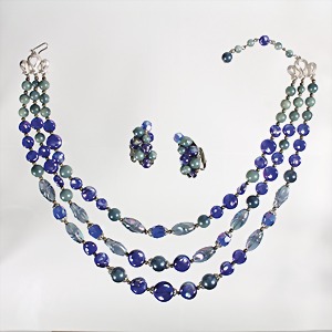 Lot: Collier u. Ohrclips, "TRIFARI" aus den 1950er Jahren, Schließe weißfarben, 3-reihiges Collier mit blauen Aurora Borealis-Glasperlen und farblich passenden Wachsperlen, an der Schließe (S-Haken) signiert: Trifari, L = 38,5 - 43,0 cm; Ohrclips, auch signiert, H = 34,4 mm