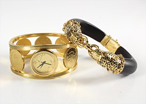 Lot: zwei exklusive Armspange von Franklin Mint 1987 (signiert FM Franklin Mint 1987), 1 Spange mit 2 Panther-Köpfen. Eine Kopie des prunkvollen Armreifes der Herzogin von Windsor. Die Augen der Panther sind mit rubinfarbenen Steinen besetzt. Die Pantherköpfe u. die Ringe bzw. Zwischenelemente sind vergoldet mit 22 Karat. Der Reif selbst ist aus fast schwarzem Ebenholz, D innen = 66,5 x 55 mm; 1 Armspangenuhr mit umlaufenden Münzen, gesichert durch 2 Achter, B = 32,2 mm, innen ca. 60,5 x 51,3 mm, schöner Zustand !
