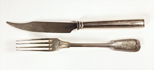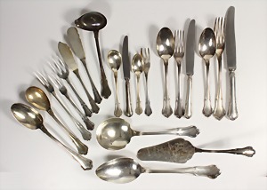 Eßbesteck 128 Teile, Silber 800/000, sig. Koch & Bergfeld (Symbol), Bremen, je 12 Dessertgabeln L = 19,7 cm, Dessertmesser L = 21,2 cm u. Dessertlöffel L = 19,0 cm; je 12 Gabeln L = 21,8 cm, Messer L = 21,2 cm u. Löffel L = 19,0 cm; 12 Kuchengabeln, L = 14,7 cm; 12 Kaffelöffel, L = 13 cm, 12 Eislöffel L = 14,5 cm; 3 versch. Vorlegegabeln; 3 versch. Vorlegelöffel L = 19.0 - 27,2 cm; 1 Soßenkelle; 1 Buttermesser; 11 Obstmesser L = 17,3 cm1 Torten/Kuchenheber, alles total 5,9 kg (davon Messer 1,65 kg)