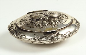 Pillendose, deutsch, Ende 19.Jhd., Silber 800/000, auf dem Deckel und umlaufenden Rand stilisierte Früchte mit Blättern, schöner Handschmeichler, ca, 64,2 x 49,5 x 25,5 mm, total 46,6 g