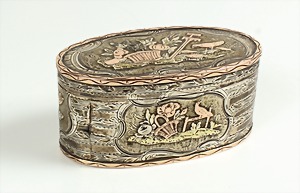 Ovale Scharnierdeckel-Dose, Frankreich um 1800, Silber, von allen Seiten mit fein ausgearbeiteten Blumen, Gartengeräten u. Singvögeln verziert, Ränder und einzelne Motive sind kupfer u. goldfarben abgesetzt, ca. 76,5 x 38,3 x 37,0 mm, kl. Druckstelle !
