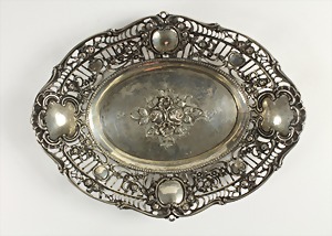 Durchbrochene Schale, deutsch (Hanau ?) Anfang 20.Jhd, Silber 800/000, sig. AMD, Rosen zieren den Boden u. den mit Stabmuster gestalteten Rand, über Kreuz kl. Schilde, ca. 20,5 x 15,7 cm, total 138,8 g