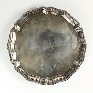 Gebäck-Tablett auf 3 Füßen, London 1764/65, sig. T.H R.M (Thos Hannam Rich. Mills), in der Mitte fein ausgearbeitete Adelskrone mit einem Adler, geschlagen u. getrieben, D = ca. 20,0 cm, H = 3,0 cm, total 321,8 g