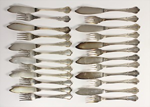 24 Teiliges "FISCHBESTECK" 1.Hälfte 20Jhd., Silber 800/000, Gabel L = 18,0 cm, Messer L = 21,5 cm, total 1240 g