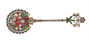 Löffel, "DAVID ANDERSON" Mitte 20.Jhd., Silber 925/000, sig. 925S Symbol (David Anderson), farbenfrohes, transluziedes Fensteremaille (plique á jour), die stilisierten Blüten u. Blätter sind umrundet von filigranen Drähten, L = 14,8 cm, sehr schöner original Zustand !