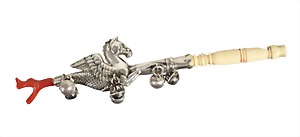 "KINDERRASSEL" um 1800/20, Silber, vollplastisch ausgearbeiteter "PEGASUS", seitlich 6 kl. Schellen, ein Ende mit Korallenast verziert, anderes Ende mit gedrechselter Pfeife (Bein), L = 16,5 cm, schöner Zustand ! Für diesen Artikel ist ein Versand in nicht EU-Länder leider nicht möglich ! No shipping outside of the EU !