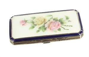 Damen Zigarettenetui "ROSEN", Österreich/Ungarn um 1900, Silber, sig. K.W, außen zartfarben, transluzid emailliert (guillochiert), Rosen dkl. blau umrandet, ca. 94,2 x 46,3 x 14,2 mm schwer gearbeitet, total 111,3 g, durch die abgerundete 8-eckige Form liegt das Etui angenehm in der Hand !
