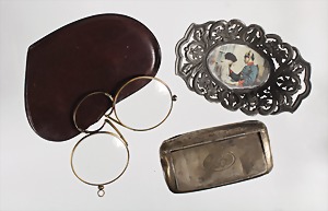 Lot: 1 Schnupftabakdose, Gravur: für 25 jähri…. (vom 1. Weltkrieg 1905-1930); 1 kl. Schälchen mit Litographie; 1 Zwicker mit Lederhülle