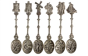 6 Löffel, versilbert, sig. DEMET, Laffeln geprägt mit höfischen Szenen, die Motive auf den Griffen stellen das tägliche Leben dar, L = ca. 12,0 cm