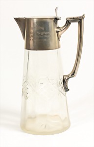 Karaffe, "JUGENDSTIL" 1908, Silber 800/000, geschliffenes Glas, mit Deckel, Gravur: DEM SIEGER im Abschieds-Jagdrennen, Berg-Märk.Reiter-Verein, 4.Oktober 1908; H = ca. 24,0 cm