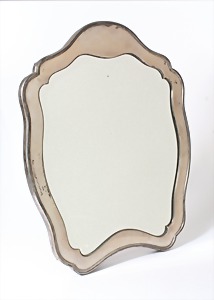 Dekorativer Spiegel um 1880/1900, Silber 800/000, sig. JH GOLDS….(Rest unleserlich !), umlaufend relefierter Rand, eingeschliffenes facettiertes Glas, rückseitig verstellbarer Aufsteller mit Metallrasterung (alte Bruchstelle am Aufsteller), Holz mit Augenoptik (Augenahorn ?), Maße: ca. 33,7 cm x 42,0 cm