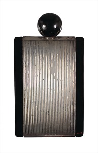Parfum-Flacon, "ART-DECO" 1920/30er Jahre, Silber 835/000, sig. LIO ? (unleserlich), beidseitig feine Linien, schwarzer Bakelitverschluß (zum Drehen), mit Feindosierung, ca 73,5 x 40,5 mm