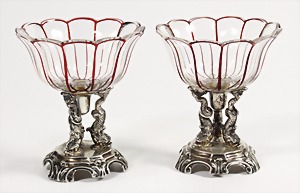 1 Paar Gewürzschälchen Ende 19.Jhd., Silber, sig. Sichel (Symbol) C, historisierend nach Vorbildern des Empire, Böhmische Glasschälchen partiel rubeliert, H = 86,0 mn, D = 75,0 mm, sehr guter Zustand !