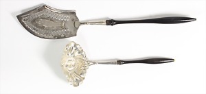 Lot: Silber 13 Lot um 1820/30, 1 Fischheber, Meisterpunze: Adler, fein durchbrochen, filigran ausgearbeiteter Fisch, ebonisierter Griff, L = 34,0 cm; 1 Kelle L = 21,3 cm