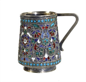 Kleiner Becher mit Henkel, Russische Cloisonné, Moskau, Beschaumarke und Meistermarke, 1896, 84 Zolotniki (Silber), floral ornamental emailliert, vorwiegend in blauen und roten Farbtönen, H = 45,6 mm