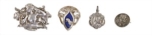 lot: art nouveau around 1900, silver 800/000 and metal (silver-plated, 1 pendant, picture of the Virgin Mary, diameter = 21.8 mm, 3 brooches: 1 head, SCHILLER, diameter = 20.0 mm, 1 female bust, floral framed, relieflike worked, c. 49.5 x 35.6 mm, (brooch element is more recent), 1 brooch, blue translucent enamel surrounded by fine-stemmed leaves, c. 29.0 x 32.7 mm