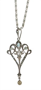 pendant, art nouveau around 1900/10, silver, colorless and gentle blue rhinestone (bordered), height = c. 56.0 mm, chain silver 925/000, lenght = 42.5