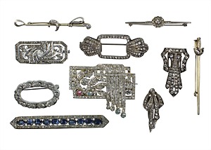 lot: various brooches, 2 dress clips (total 10 pieces), ART-DECO 1920/'40s, silver 835/000, 925/000 and metal (silver-plated), among others 1 sword lenght = 58.8 mm and 1 riding crop, white and colored studded with rhinestones ( some stones are missing !)