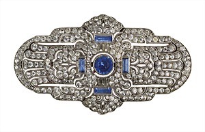 Aufwändig gearbeitete Brosche, "ART-DECO" 1920/30er Jahre, Silber 935/000, weiße u. blaue Strasssteine, aufwändig gefasst, ca. 60,3 x 34,1 mm, seitlich durchbrochen gearbeitet, schwere Ausführung !