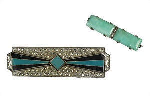 Lot: 2 Broschen, ART-DECO 1930/40er Jahre, Silber 835/000, 1 Brosche mit Amazonit und Markasiten, ca. 36,0 x 9,2 mm; 1 Brosche, farbiger Lack, weiße Strasssteine, Brosche mit durchsichtigem Kunststoff überzogen, ca. 62,0 x 18,2 mm