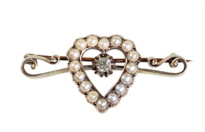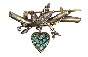 Brosche, 1870/80er Jahre, Silber, Reste alter Vergoldung, Taube auf einem Ast sitzend, 1 rotes Steinauge, Körper mit 1/2 Perlen besetzt, abgehängtes Herz mit Türkisen, L = 41,0 mm