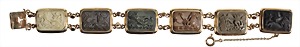 Lot: Armband und Anhänger, Asien, China ?, Armband, Silber 800/000, signiert: SILVER UI.M 800, farbige Steincabochons, Kastenschloss mit Sicherheitskettchen, L = 18,5 cm, B = 25,5 mm, feine Drahtarbeit; 1 Anhänger GG 333/000, gravierte Jade, H = ca. 43,0 mm