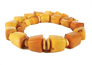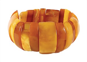 amber bracelet, "BUTTERSCOTCH", curved plates on a double elastic band, broad = c. 29.6-31.6 mm, inside: diameter c. = 56.5 mm, total 45.7 g