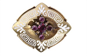 Brosche, BIEDERMEIER 1.Hälfte 19.Jhd., golddoubliert, zentral 5 Almandine (facett.), weiß emailliertes Mäandermuster, von hinten als Medaillon gearbeitet (mit orig. Haarlocke), ca. 37,8 x 31,8 mm