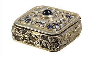 small pill box, silver 800/000 gilded, signed JS (Jean Sturm, Hanau), cover is set with sapphires and 1/2 pearls, cover and pages are around floral engraved, c. 24.0 x 24.0 x 12.5 mm