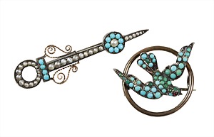 lot: always 1 brooch/pin, 1870/'80s, silver, 1 brooch, swallow, signed diameter, 1 garnet eye, body set with turquoises, diameter = c. 26.5 mm, 1 pin, set with turquoises and 1/2 pearls, lenght = 50.8 mm